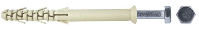 dybel ramowy, koszulka nylonowa z długą strefą rozporową, wkręt z łbem sześciokątnym, ocynkowany na biało